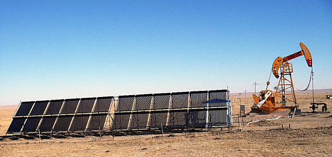工藝流程:將太陽(yáng)能集熱來(lái)的熱工質(zhì),通過(guò)加壓泵加入空心桿內(nèi)管中,熱工質(zhì)沿內(nèi)管向下循環(huán),到底部,再到管外(桿內(nèi))往上方流動(dòng)將熱量通過(guò)桿壁傳給原油,周而復(fù)始;原油溫度升高,被加熱后降粘的原油,由抽油桿提到地上,再由輸油管道輸走。從而達(dá)到較理想的降粘目的。